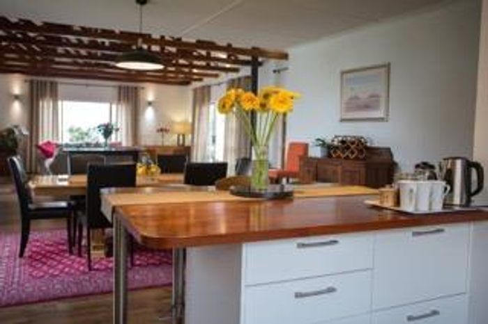 3 bedrooms, 2 bathrooms, guest toilet, open-plan kitchen, lounge with fireplace, double garage, patio, garden shed, alarm system.