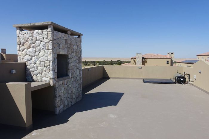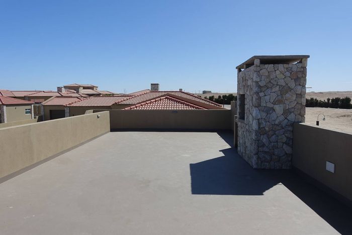 Beachfront entertaining in Swakopmund, direct sand access, pool-equipped entertainment room with built-in BBQ and first-floor master suite with sweeping Atlantic views.