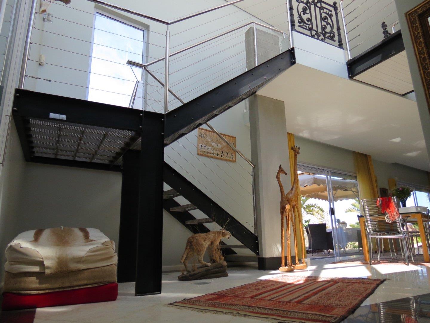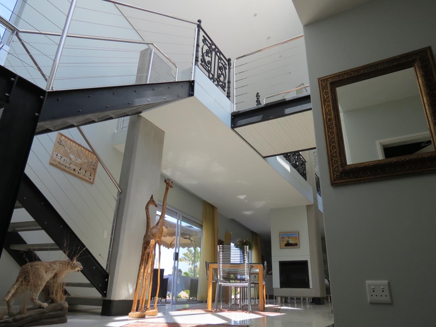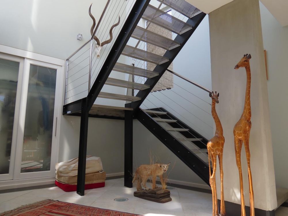 * A modern steel staircase leading up to a comfortable lounge with lovely dune views, a build-in fireplace and impressive cast iron railing