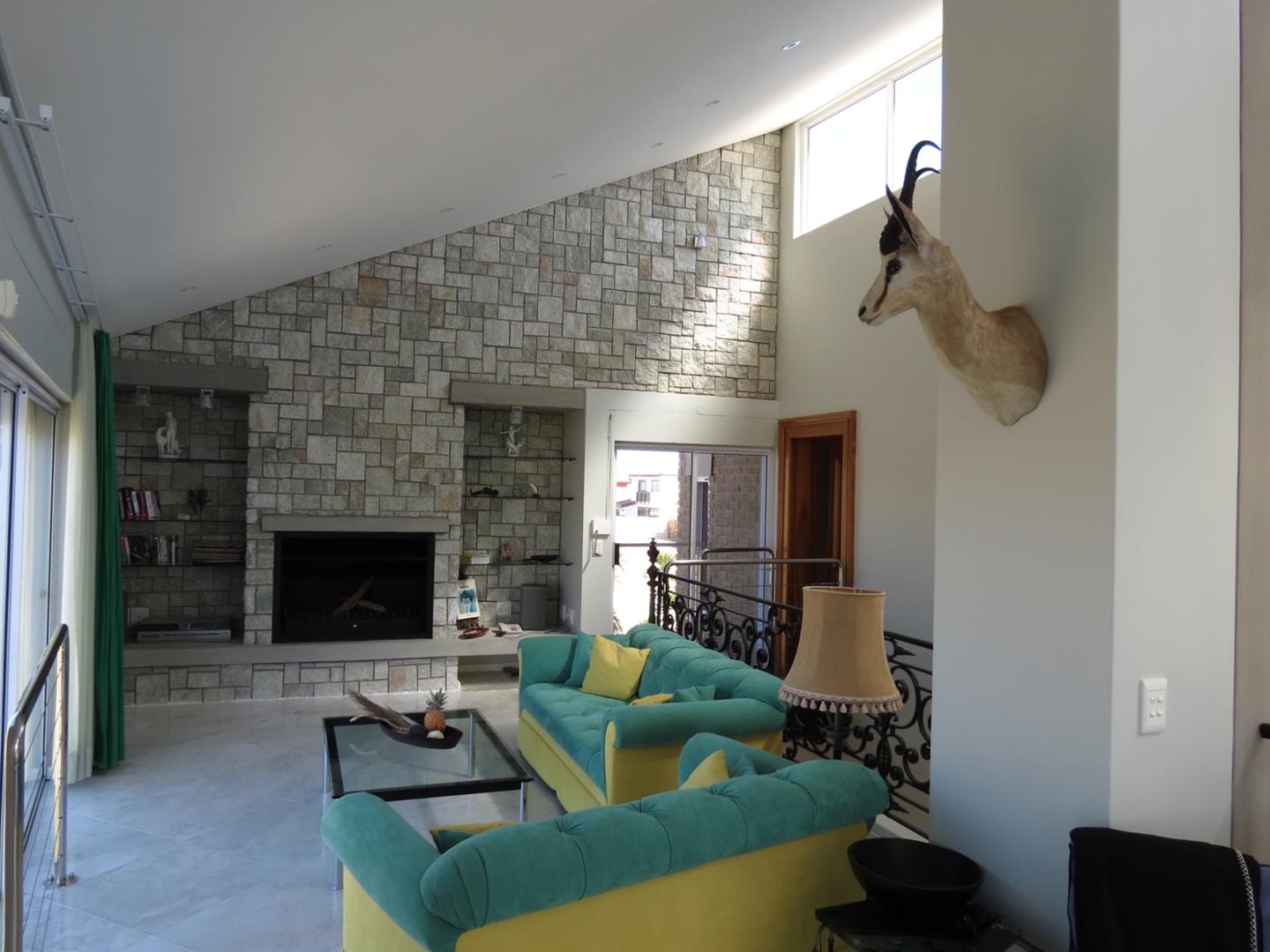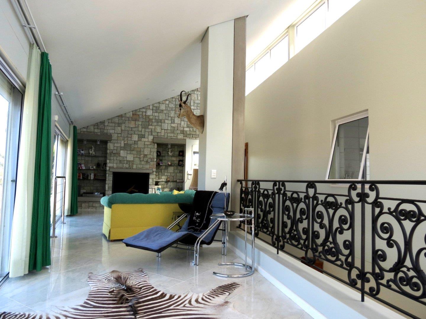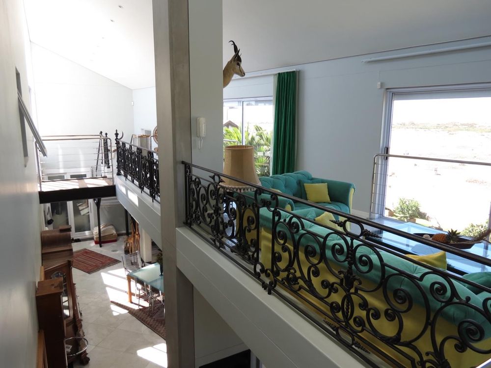 * A modern steel staircase leading up to a comfortable lounge with lovely dune views, a build-in fireplace and impressive cast iron railing
