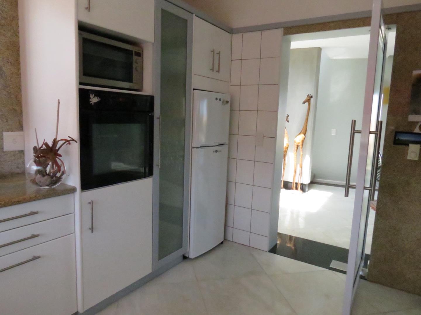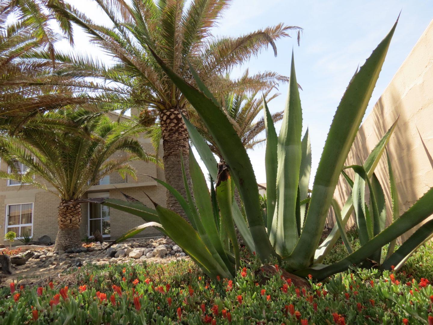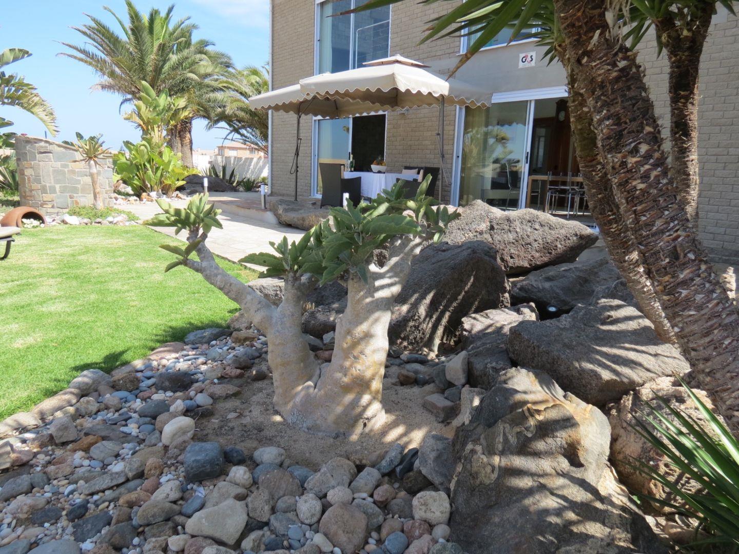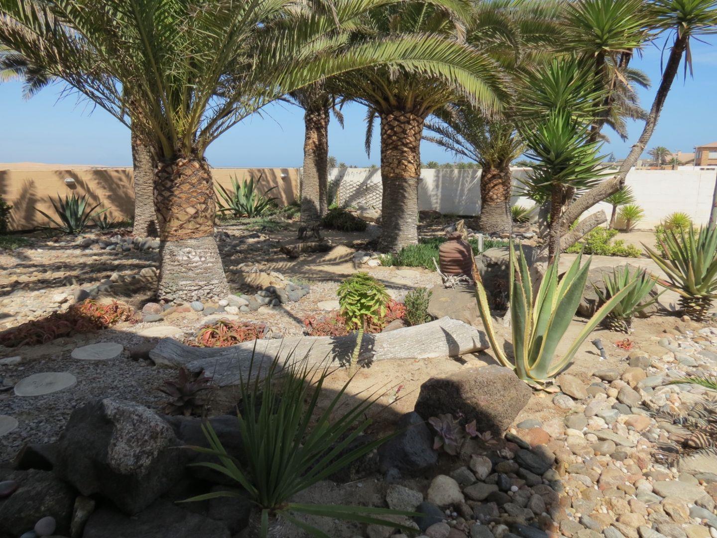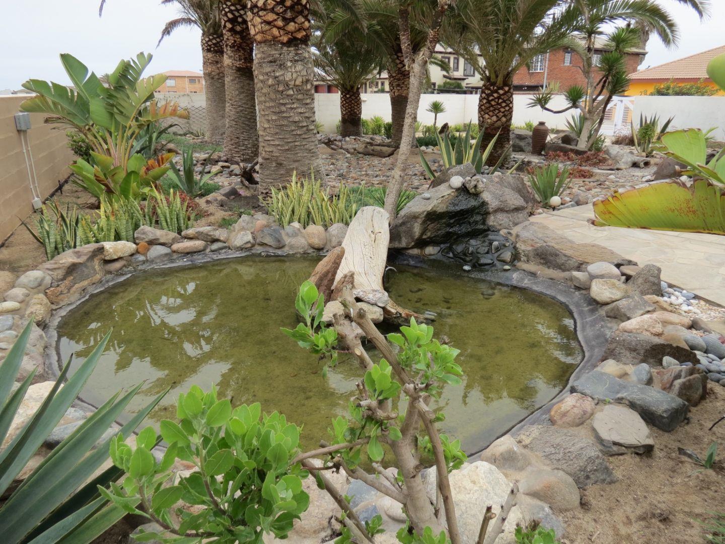Subtropical palm garden with flat rock paving, tall palm trees, irrigation system, rockeries, lighting, a large pond and build-in Braai plus separate