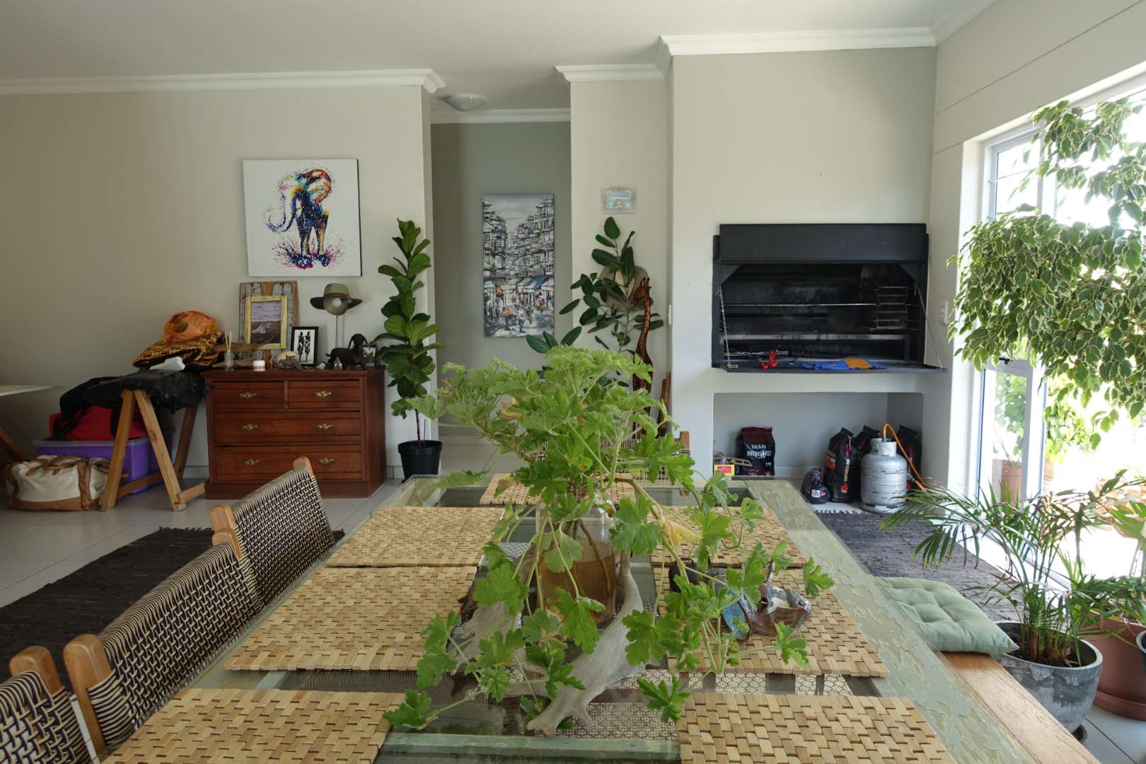Open-plan living and dining area with an indoor BBQ, ideal for entertaining