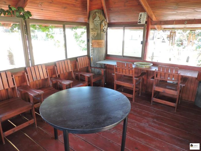 A registered hunting lodge with accommodation, main building, guest entertainment area, staff quarters, animals, vehicles, and power facilities.