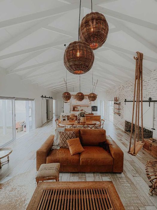 Coastal living steps from the beach and ocean in a brand-new family home — open-plan living under exposed trusses, indoor BBQ and wind-protected courtyard; three bedrooms, 2.5 baths, double garage.