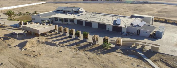 Elevated property with multiple structures, including dwellings, warehouses, and facilities, featuring solar power, water systems, and scenic views.