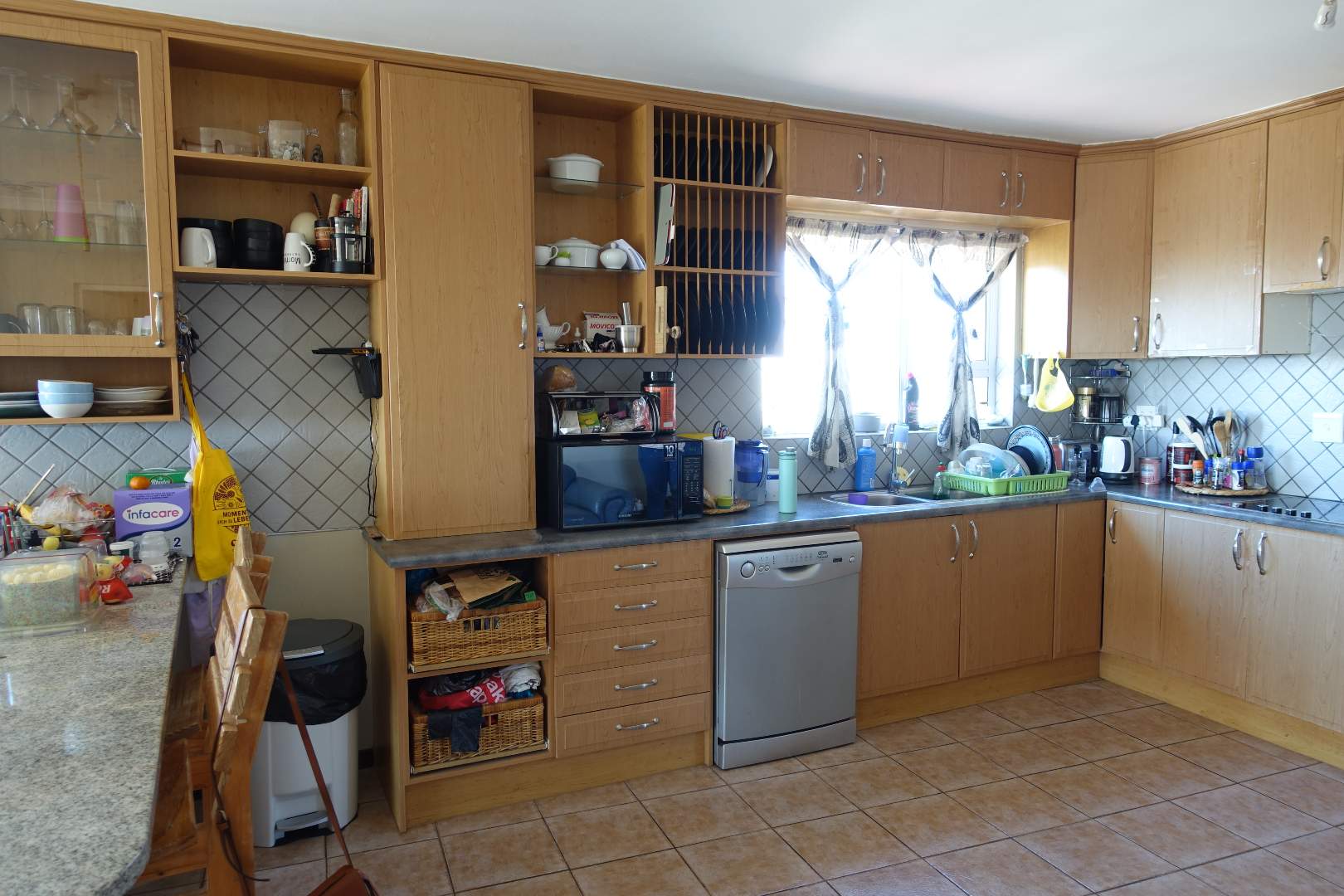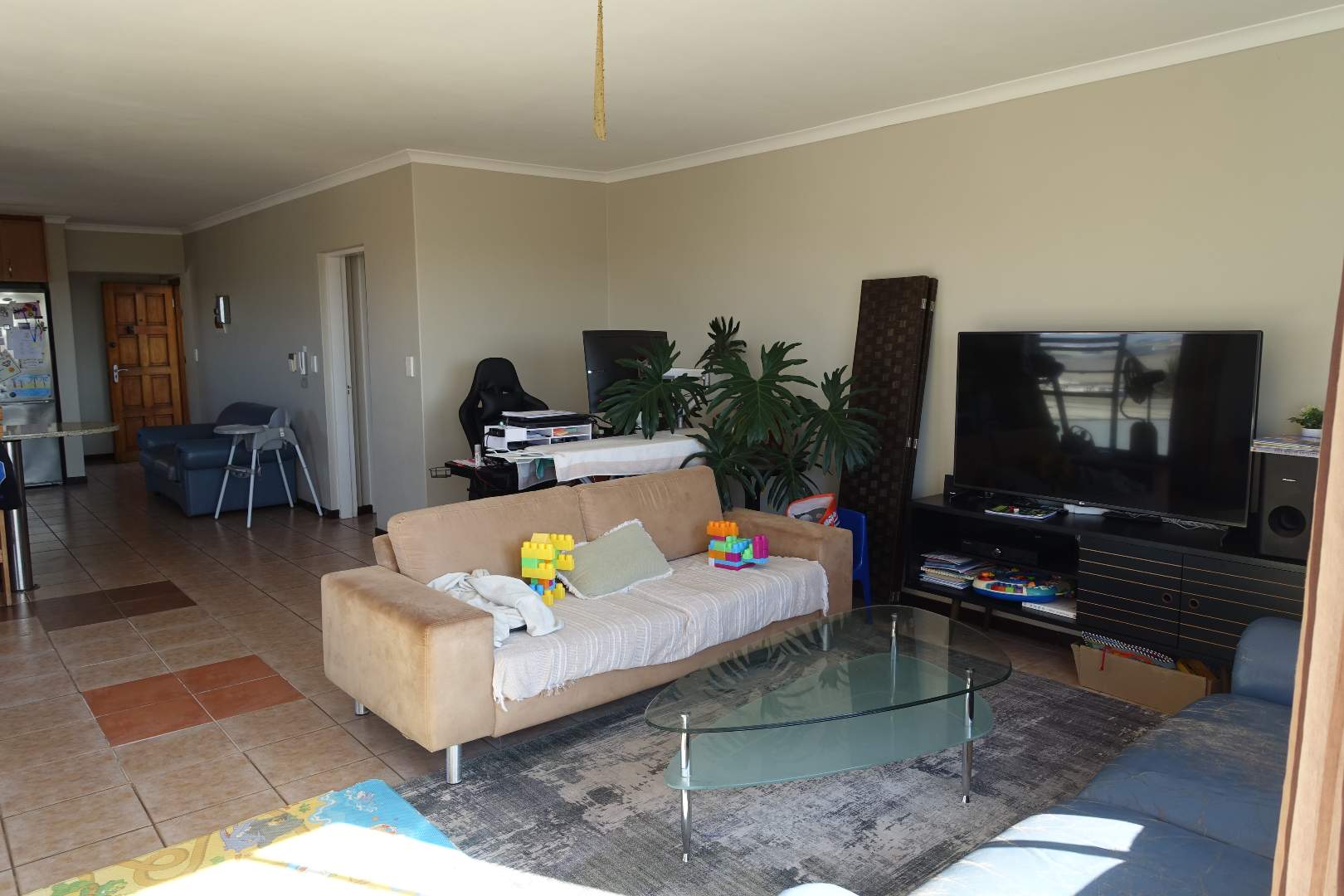 Spacious open-plan kitchen, dining- and living area with sliders leading onto the balcony