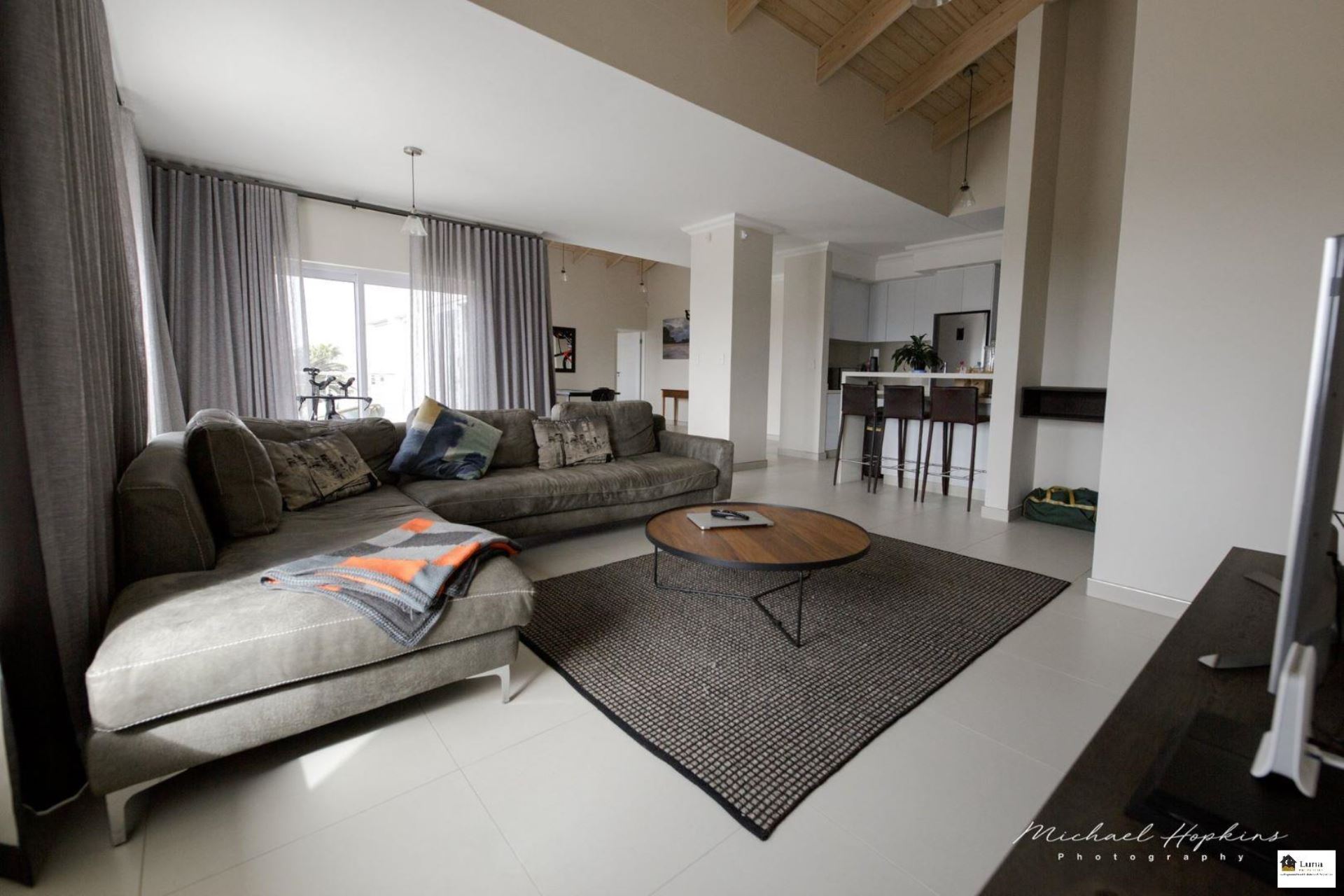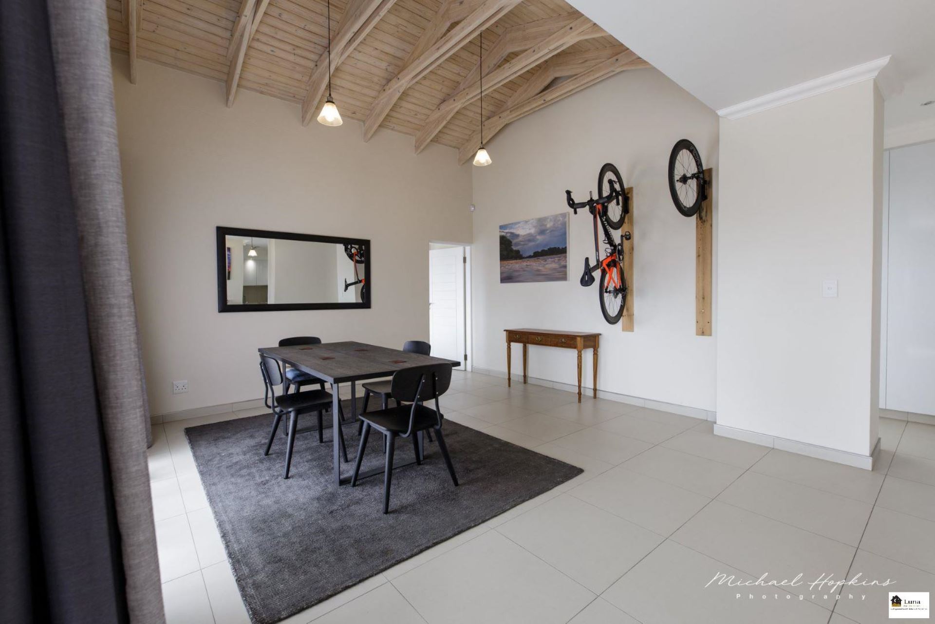Large living room/ dining room with exposed wood trusses